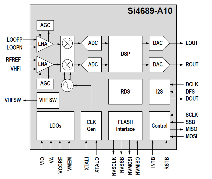 Příklad blokového schématu přijímače single chip uvádím na obrázku vpravo. Čip obsahuje vysokofrekvenční nízkošumovou část (zesilovače, řízení zisku, směšovače), tj. worldwide FM band support (76–108 MHz), advanced RDS/RBDS decoder, FM HD Radio support with on-chip IBOC blend, DAB, DAB+ Band III support (168–240 MHz), supports WorldDMB Receiver Profiles 1 and 2, integrated OFDM channel demodulator, integrated de-interleaving SRAM, zdroj hodinových kmitočtů, tj. fully-integrated VCO / PLL / synthesizer, ADC převodníky, DSP, DAC převodníky, které vyrobí nízkofrekvenční stereofonní signál (digital audio out with ASRC, Integrated 97 dB stereo audio DAC, concurrent I2S/L-R stereo audio out, full range of signal quality metrics) a obvody řízení přijímací části (SPI and I2C host control interfaces).