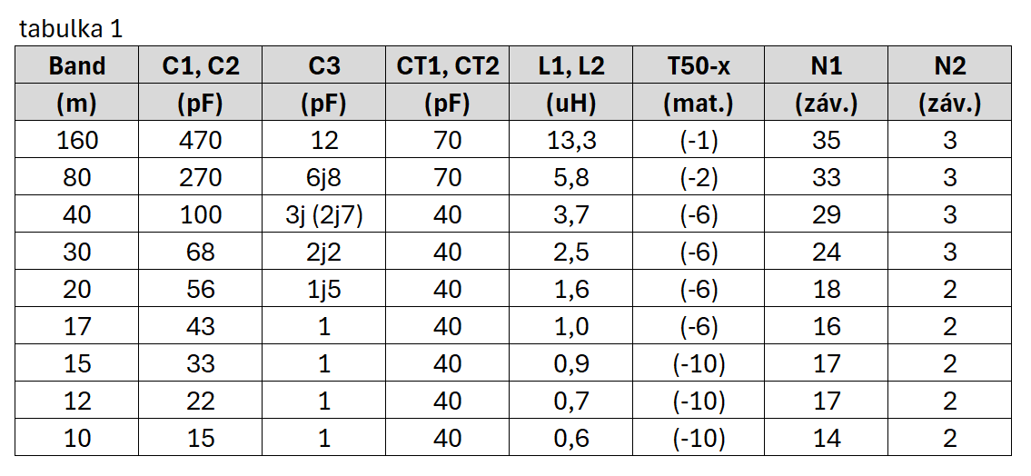 (kapacity, indukčnosti, materiál jádra, počty závitů) pro každé pásmo