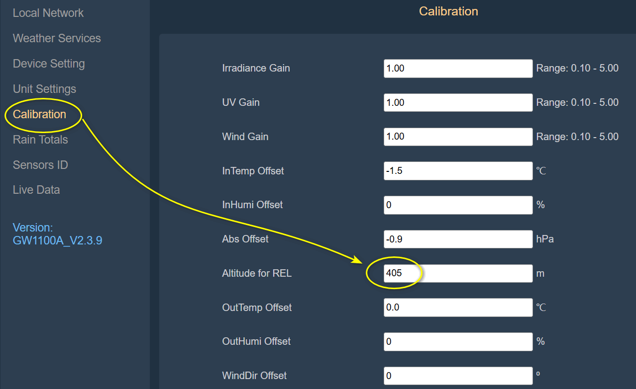 Brána obsahuje čidlo absolutního barometrického tlaku, které se mi podařilo kalibrovat s nádhernou přesností. Jsem proti stanici ČHMÚ o 6.4 m výše (401 m/mořem) a čidlo absolutního tlaku mi za klidných podmínek vždy ukazuje hodnotu o 0.3 hPa nižší, než čidlo stanice ČHMÚ. Řešení obsahuje mě neznámý přepočet absolutního tlaku změřeného na stanici na tlak přepočtený na hladinu moře. Tento tlak je na webu Ecowitt zobrazen jako tlak relativní. Přepočet pracuje se zadanou nadmořskou výškou. Zde se to nastavuje: