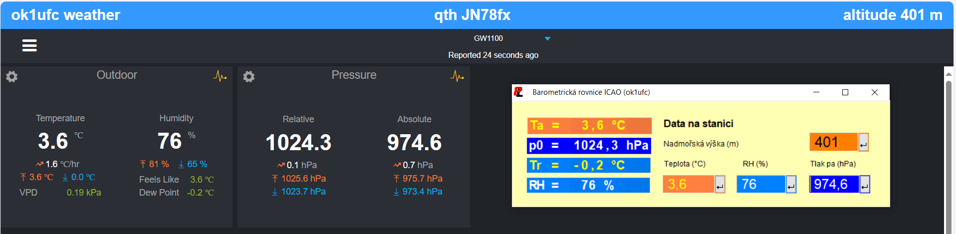 Náhodná kontrola - porovnání s výpočtem podle barometrické rovnice ICAO, Vlevo jsou naměřené hodnoty, ve světlém okně vpravo je kontrolní výpočet p0 a teploty rosného bodu: