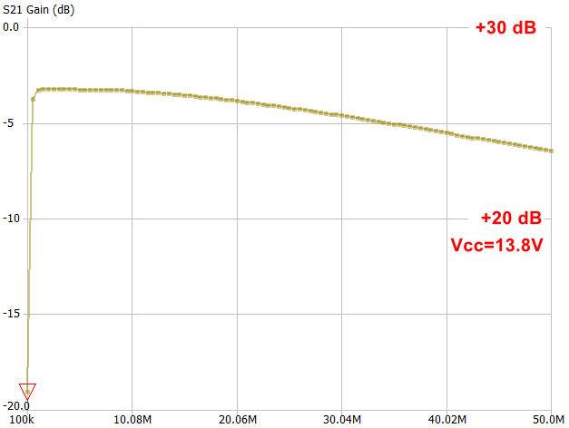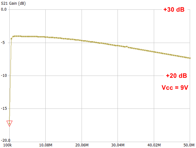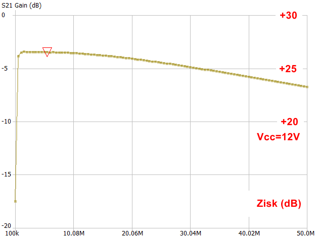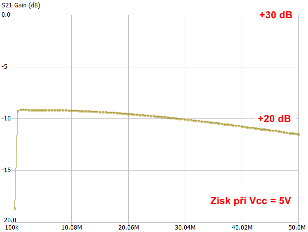 Na obrázku vpravo je zisk změřený při jmenovitém napájecím napětí Vcc = 12 V.