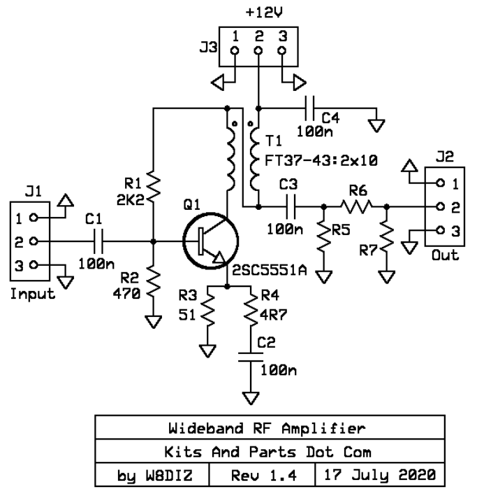 Předzesilovač W7IUV byl svým designem dobře dotažený, na tom se podepsal dlouholetý vývoj autora, mnoho modernizací a velká zpětná vazba mnoha uživatelů. Nevýhodou řešení je, že aktivní prvek, tranzistor 2N5109 nebo 2N3866 není jednoduše nahraditelný jiným typem polovodiče. Na internetu se objevilo řešení od W8DIZ, které bylo konstruované s tranzistorem ONSemi, typ 2SC5551A. Tato konstrukce byla i v roce 2025 dosažitelná jako stavebnice na internetu: https://www.kitsandparts.com/rfamp1.4.php, schéma a fotografie mé realizace - viz níže.