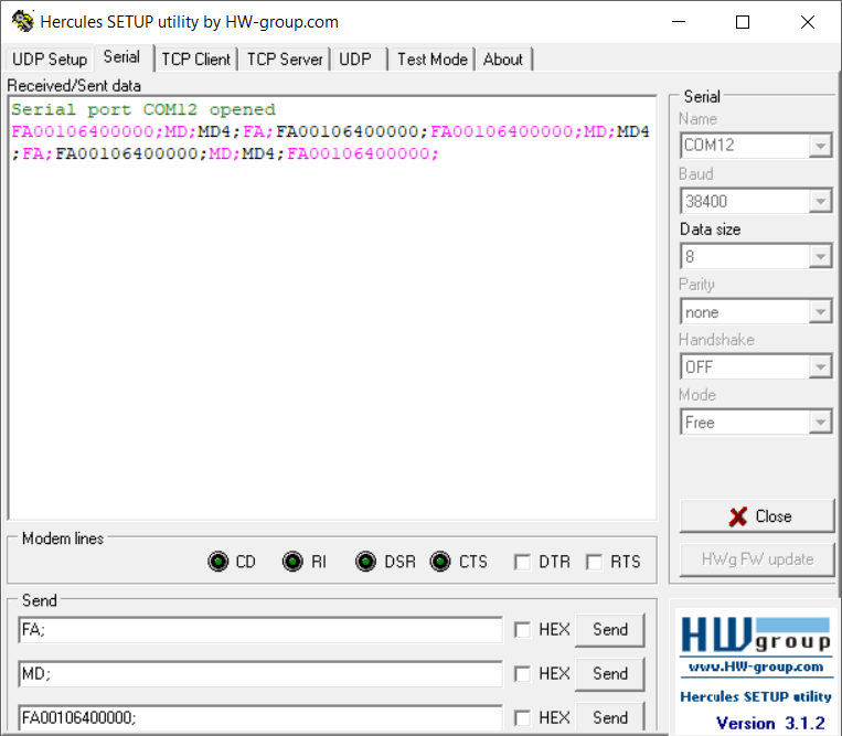 3. Vyzkoušíme příkazy, které jsou předmětem zájmu. Například příkaz FA; (je stejný, jako u Yaesu) odešle do SDR Console dotaz, jaká je frekvence oscilátoru RX. SDR Console odpoví například takto: FA00106400000; vidíte, že příkaz má pevný formát s 11 místným zobrazením kmitočtu v Hz. Podobně, po dotazu MD; nám SDR Console odpoví MD4; odpověď je podobná Yaesu FT-710, ale není stejná (Yaesu by odpovědělo MD0B;).