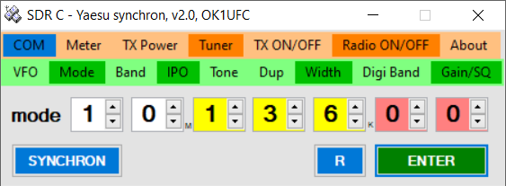 2. Popsaný synchronizér tedy čte informace o kmitočtu a módu z SDR Console a podle těchto informací synchronizuje přesně a okamžitě TCVR Yaesu FT-710 na můj pokyn (stisk tlačítka "SYNCHRON". Ze synchronizéru však lze nastavovat mnohem víc parametrů rádia Yaesu. Parametry a hodnoty se volí kliknutím na položky dvou řad menu. Lze řídit nastavení měřidla (S-metr, Power, ALC...), výkon TX, interní tuner, PTT, lze zapnout/vypnout TRX, lze pracovat s VFO, módem, s pásmy, s IPO/ATT, s šířkou pásma filtru a s dalšími parametry.