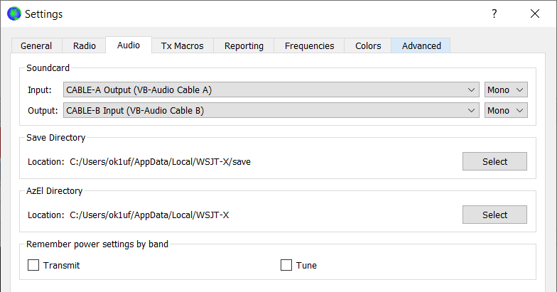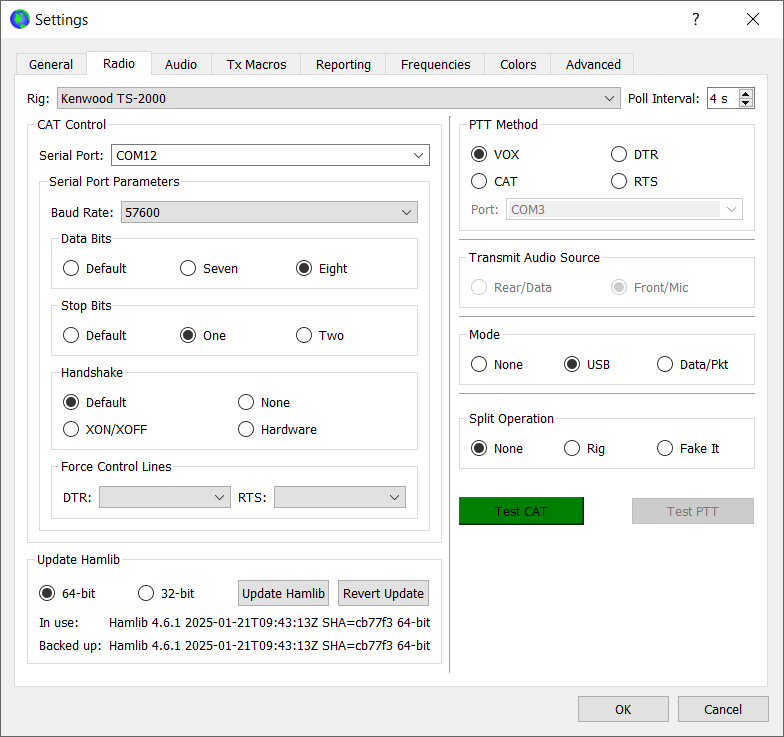 3.2 Spustit a nastavit WSJT-X takto (nastavuje se Radio a Audio), lze vyzkoušet "Test CAT":