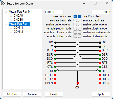 3.1 Spustit VSPE a vytvořit pár mezi COM11 a COM12 (po vytvoření si pár uložíme na disk, abychom to příště nemuseli dělat).