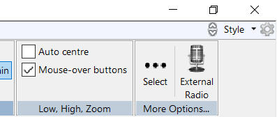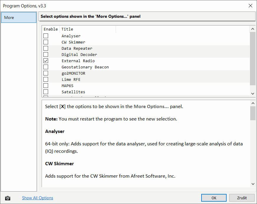 V menu "Program Options", které se zobrazí po kliknutí na "Select" - viz obrázek vpravo, byla zaškrtnuta položka "External Radio". Později jsem však zjistil, že řízení via COM funguje, i když není položka "External Radio" zaškrtnutá, a to i po restartu, kdy z menu zmizí ikona "External Radio":
