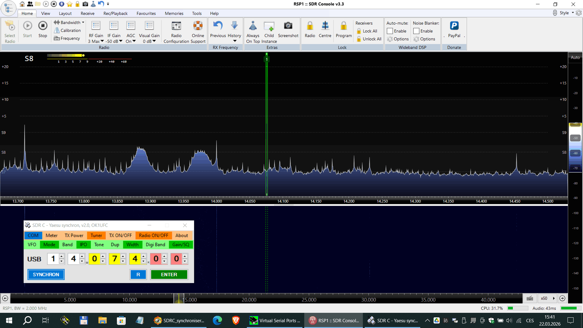 1. Výše popsané řešení je prosté a funguje. Nemusím používat SW OmniRig. SDR Console reaguje po spuštění na příkazy téměř bezprostředně. SDRC synchronizátor mi umožní rychle nastavit rádio Yaesu na kmitočet a mód, dále mi umožní rychlé další ruční nastavení, pokud je třeba.
