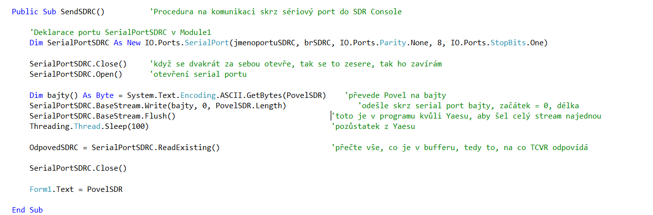 Aby nám šla práce od ruky, tak příklad s fungujícím kódem sériové komunikace (napsáno ve starší verzi Visual Basic z Visual Studia 2010) vypadá takto: