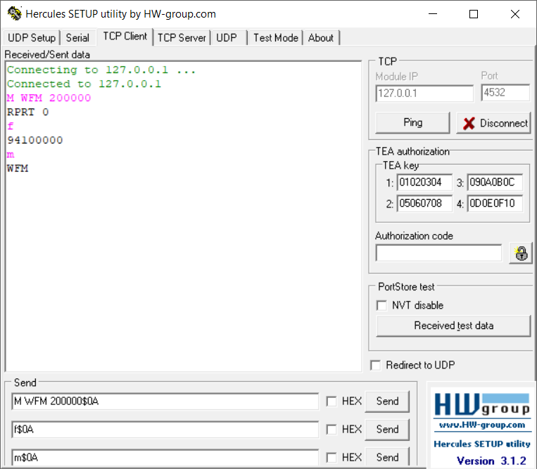 Zvolím záložku TCP Client, nastavím IP: 127.0.0.1 a Port: 4532.