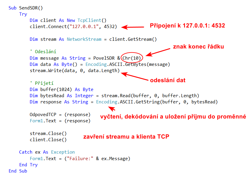 7. Kontrolér otevírá TCP klienta je po dobu nezbytnou k odeslání a k příjmu streamu s příkazy a krátkými daty. Po ukončení těchto operací je stream i client uzavřen (dva poslední řádky s příkazy stream.Close() a client.Close(). Proto můžete mít klidně spuštěno mnoho instancí takových prográmků a při ručním odesílání povelů zjistíte, že prakticky nikdy nedojde ke kolizi v komunikaci klienta s TCP serverem programu SDR++.
