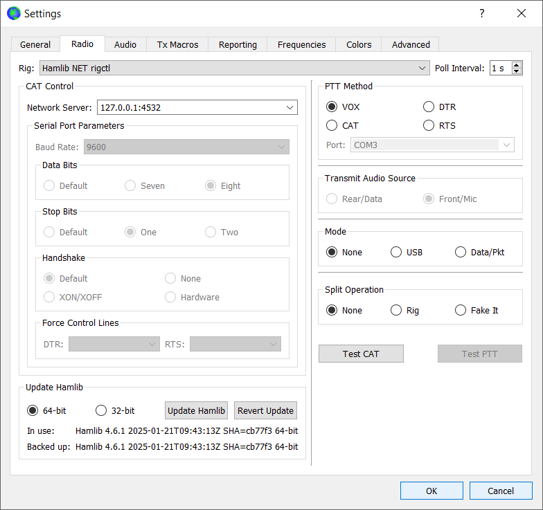 5. Program SDR++ rovněž spolupracuje s programem WSJT-X pro digitální komunikaci. TCP komunikace je realizována s využitím Hamlib NET ctl a nastavení ve WSJT-X vypadá takto. Nesmíme zapomenout propojit audio s použitím virtuálních audio kabelů (VB-Audio cable A a B). Současný běh WSJT-X a výše popsaného kontroléru není možný. Rovněž doporučuji vyvarovat se v programu WSJT-X některým příkazům, například neklikat na tlačítko "Test CAT".