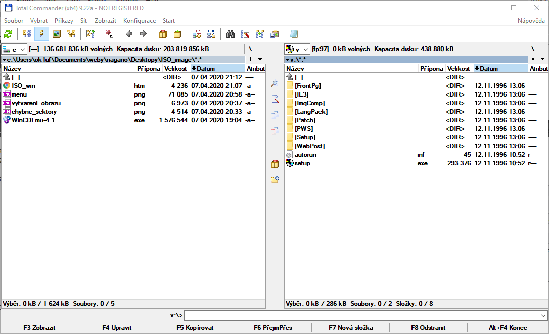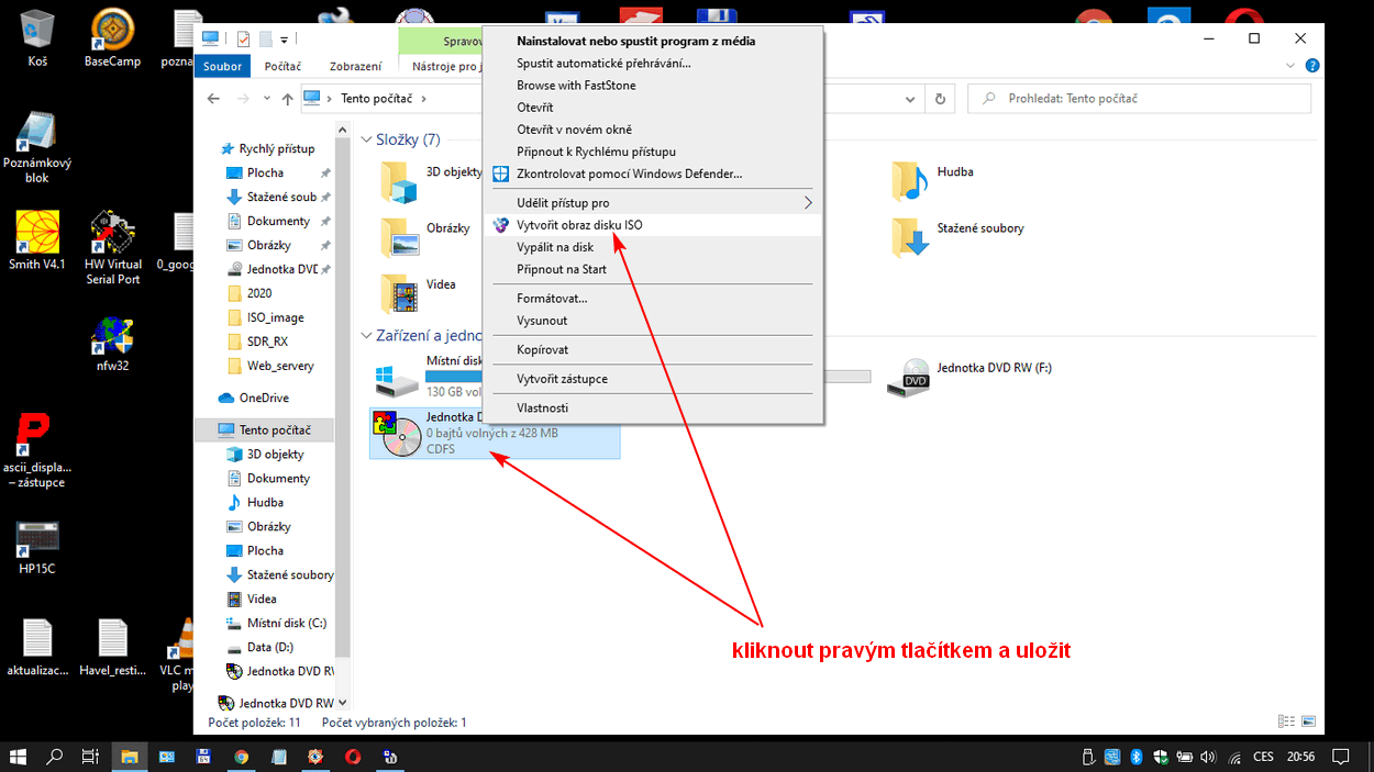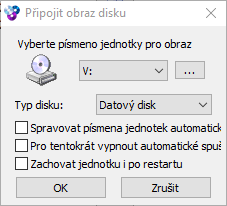 Po ukončení zápisu můžeme vytvořený ISO soubor připojit jako mechaniku (lze vybrat písmeno disku, např. V:)