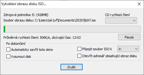Program otevře svá menu a stavová okna, nabídne nám, kam ISO obraz uložit a začne ISO obraz zapisovat do souboru.