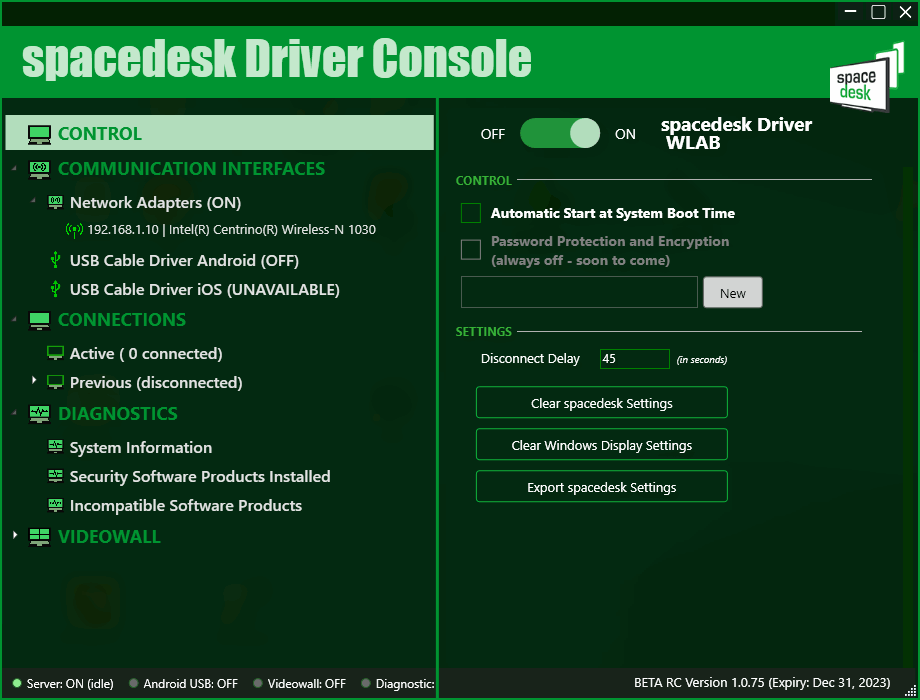Na PC, kterému potřebujeme rozšířit obrazovku, nainstalujeme tzv. serverovou aplikaci, která vypadá po spuštění takto: