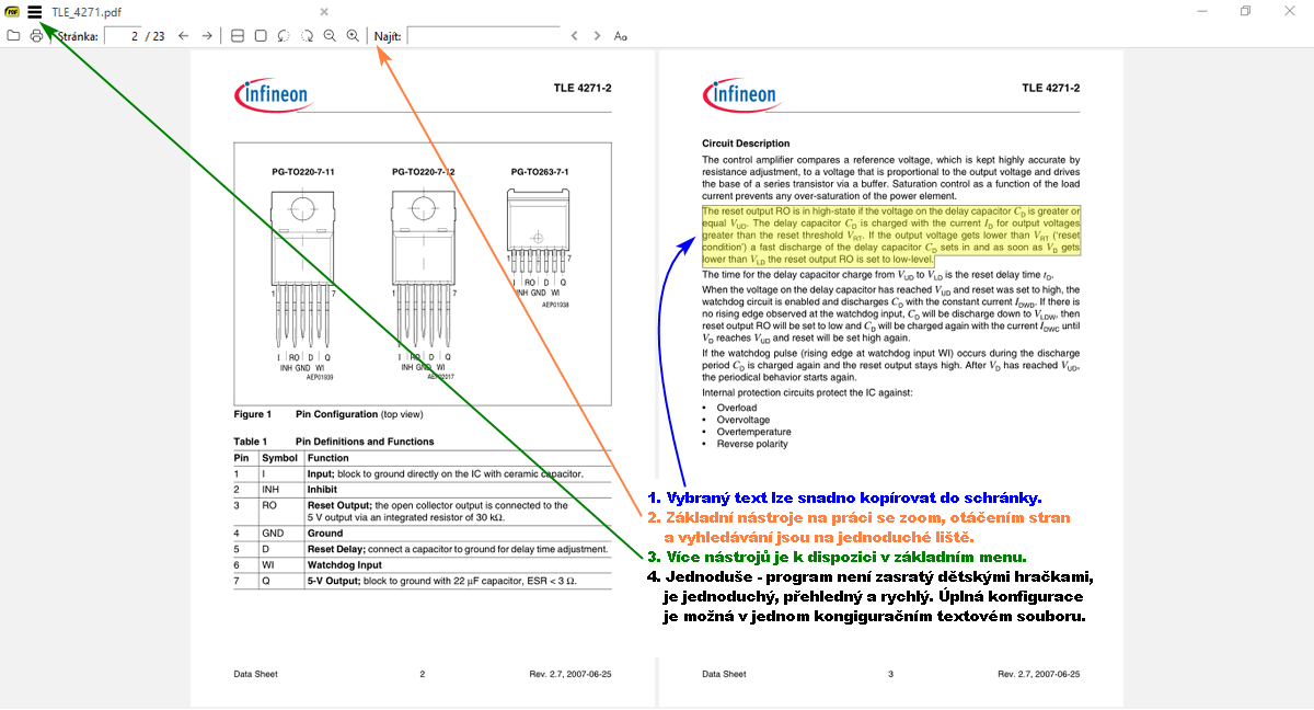 Bylo rychle rozhodnuto. Jak to v takových případech bývá, sáhl jsem ke konkurenčnímu řešení, které má potřebné funkcionality pro práci s měřítkem, otáčením a zobrazováním stran a disponuje elegantním nástrojem na výběr a kopírování textu. Ten program se jmenuje Sumatra, existuje i v portable verzi, která se nikam neinstaluje. Přidám rád odkaz na stránku autorů. Rovněž je ke stažení z mého archivu. Prohlížeč je rychlý, ergonomický, elegantní a umí zobrazovat nejenom pdf dokumenty, ale i formáty čteček elektronických knih. Náhled na selektovaný a kopírovaný text: