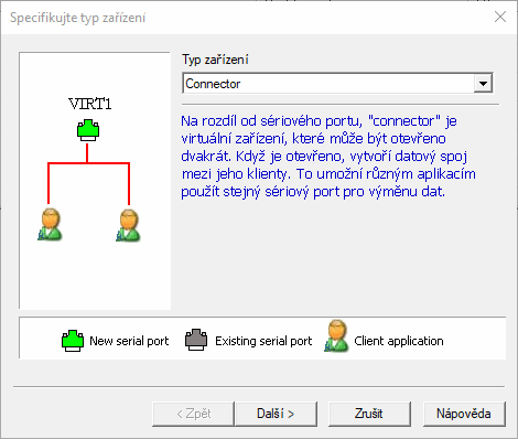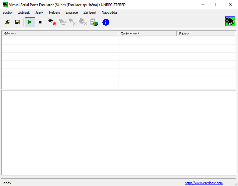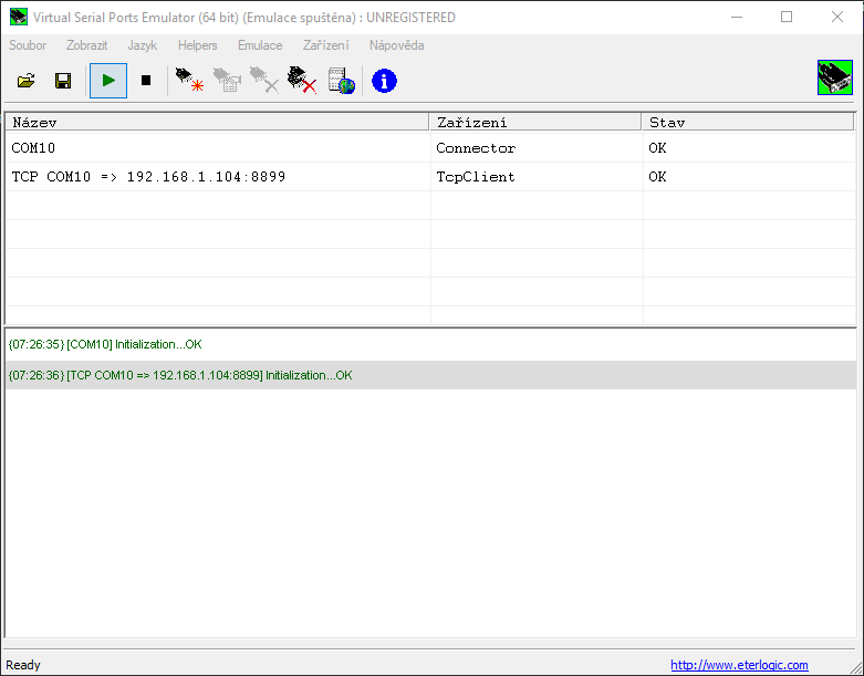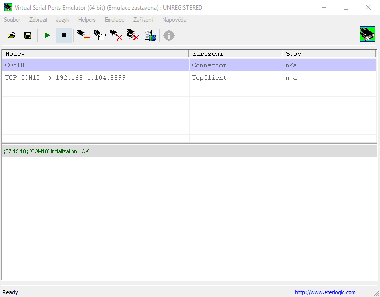Použitý emulátor sériového portu Eterlogic funguje výborně. Mě