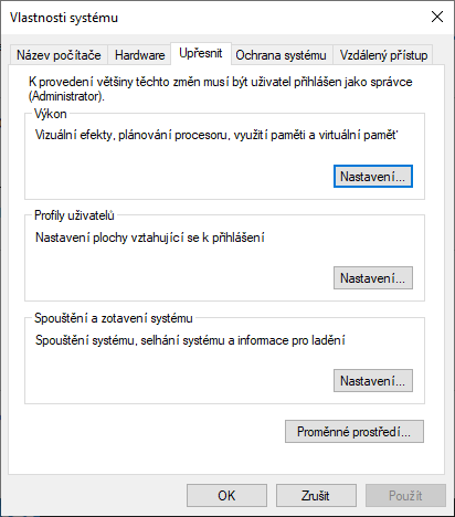 Spustíme-li Vlastnosti systému, zobrazí se nám položky, jako v předchozím bodě č. 5 (další obrázek dole). Z tohoto menu lze spustit Upřesnit nastavení systému, dále Vlastnosti systému (vlevo dole) a Možnosti výkonu (vpravo dole).