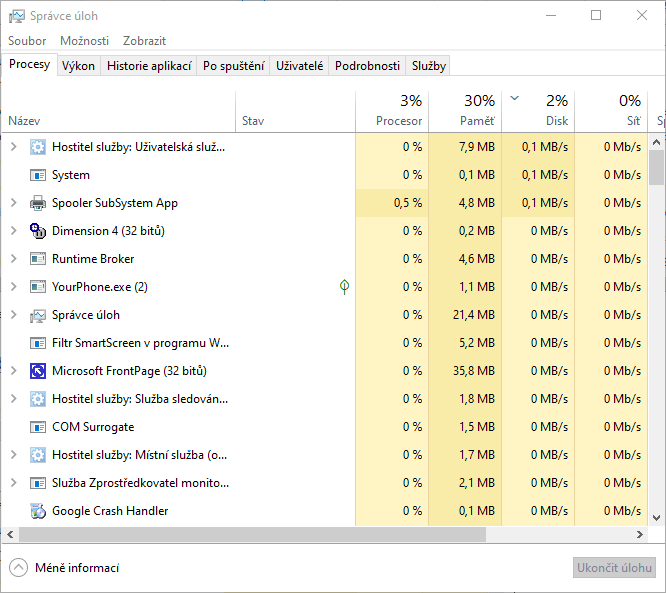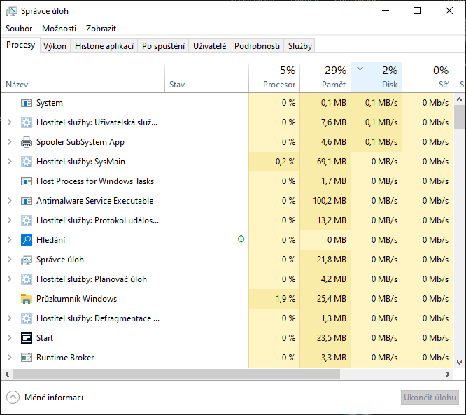 mi slouží, konečně sedá. Nejvíce je vytížená paměť (29% z 8 GByte,