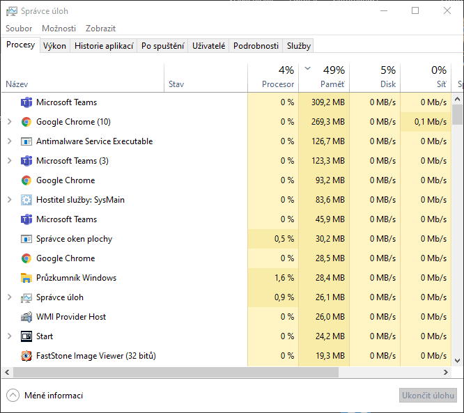 Chrome a MS Teams) již má spotřebováno přes 50% paměti. |