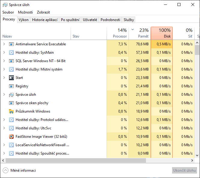 vytížení procesoru (14%) je v pohodě, paměti (23%) také, disk