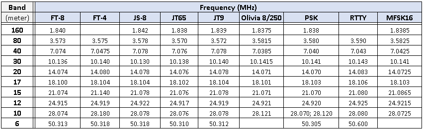Tabulka není seznamem všech digimódů. Chápejte ji pouze jako výběr