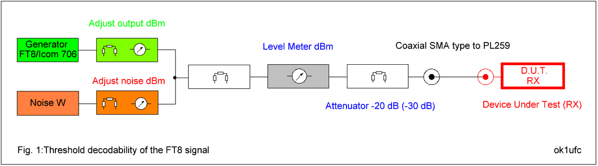 Signál FT8 i signál z šumového generátoru lze mísit na atenuátorech a lze měřičem úrovně (Level Meter dBm) měřit jejich úroveň s rozlišením úrovně cca 0.5 až 1 dBm.