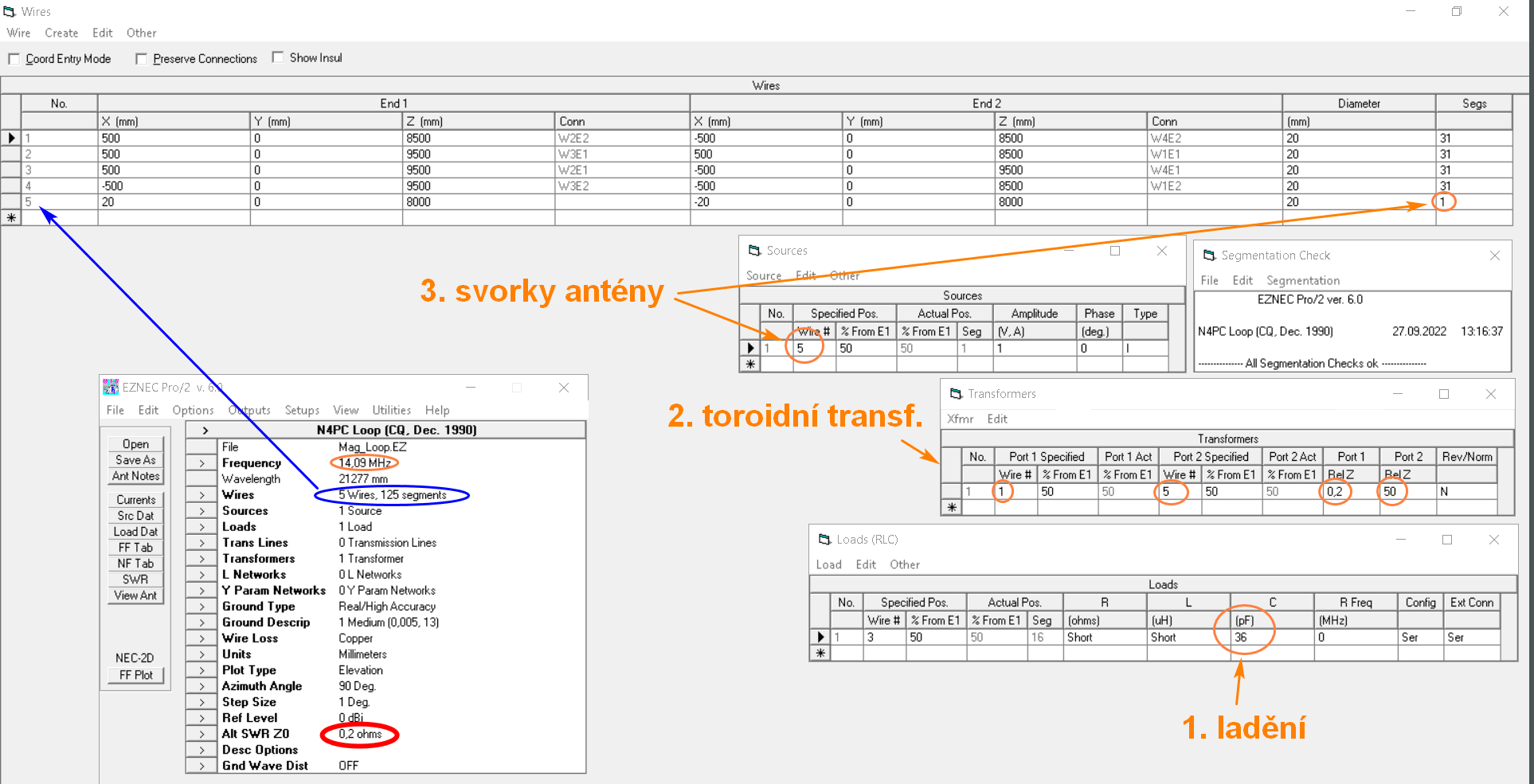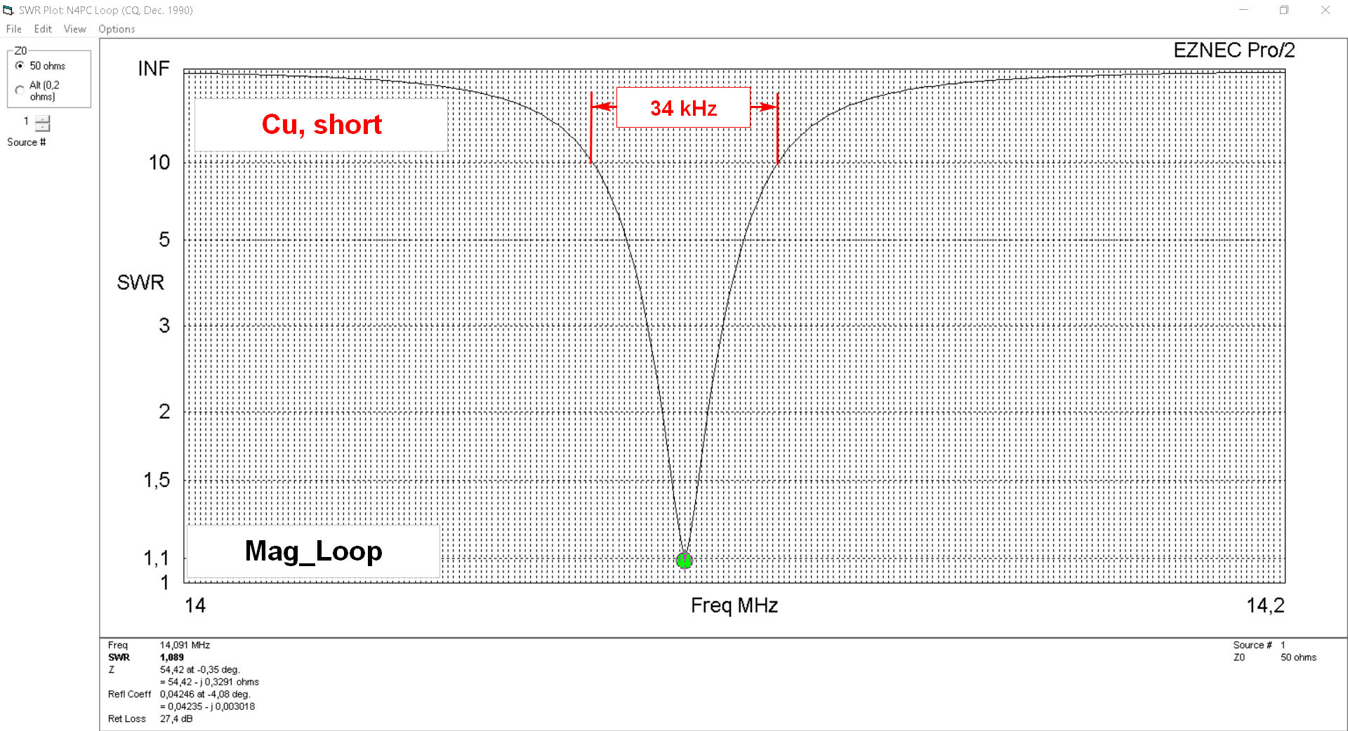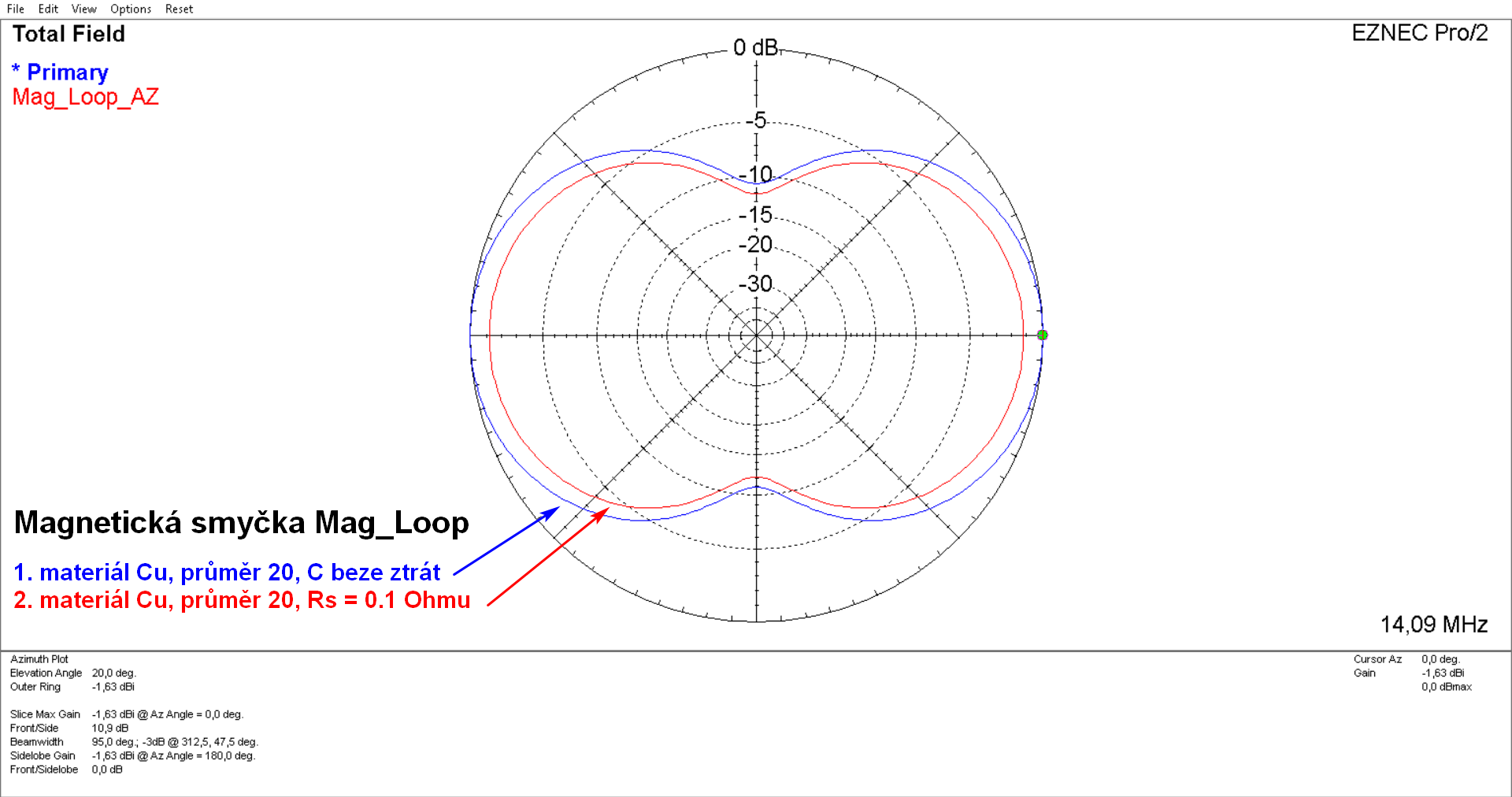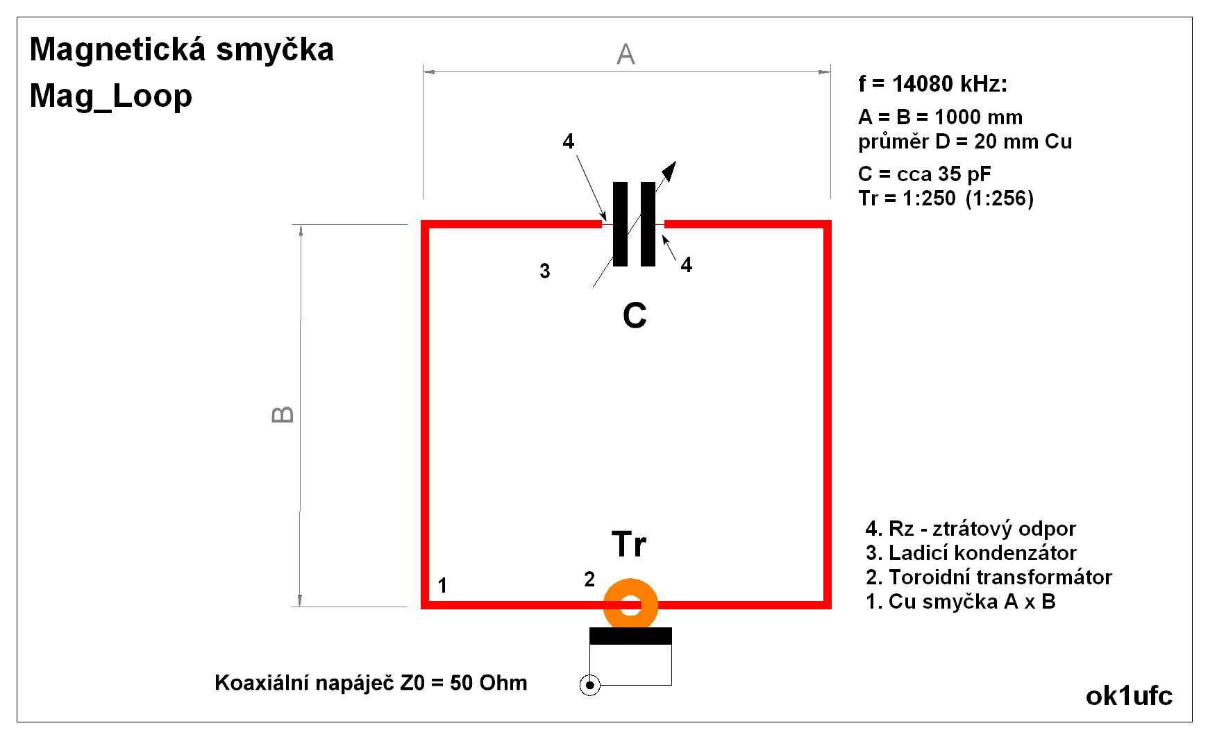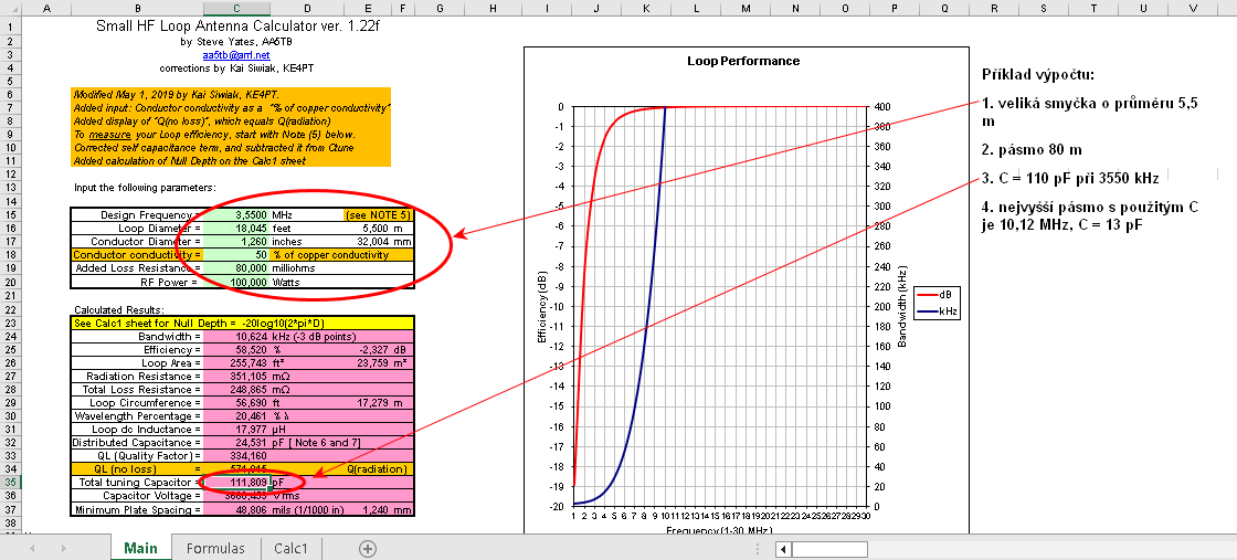 Modelováním bylo dokázáno, že laděná magnetická smyčka o obvodu asi 0.2 WL má s kvalitním kondenzátorem asi o 10 dB horší zisk proti dipólu, a to za předpokladu, že je instalovaná ve volném prostoru ve výšce H = 9 m. Jenže, co naděláme, když nemáme pro instalaci půlvlnné antény potřebný prostor. Pokud konstruujeme laděnou magnetickou smyčku, vždy použijeme kvalitní kondenzátor C, který nesmí mít žádné třecí kontakty a všechny desky musí být propojené tlustým kusem vodivého materiálu. Jinak anténa příliš nefunguje. Orientačně si ztráty antény ověřujeme měřením šířky pásma a srovnáním s šířkou pásma modelu EZNEC.