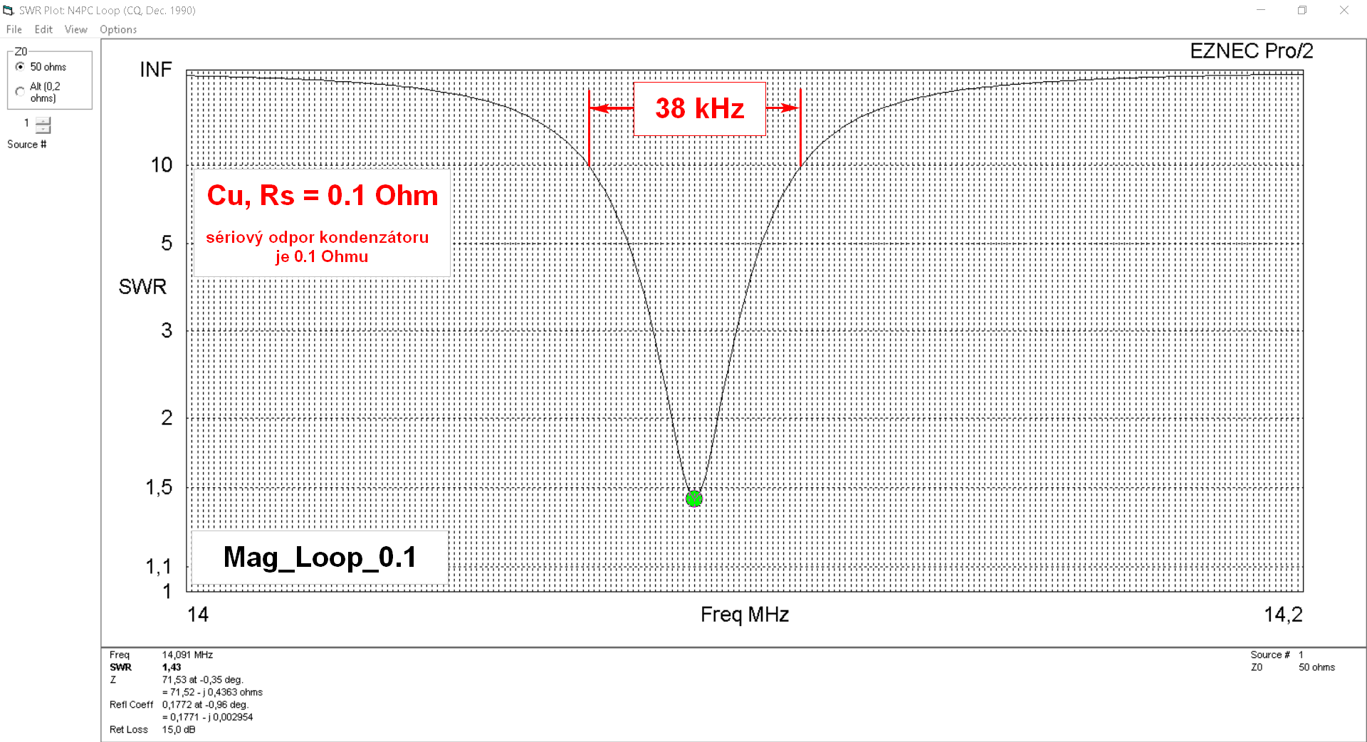 A opět provedeme výpočet. Rezonanční kmitočet se příliš (téměř vůbec) nezměnil. Zato průběhy impedancí se změnily velice podstatně - viz hodnoty vlevo dole pod diagramem. Rovněž se změnila šířka pásma. Pro VSWR menší, než 10 je cca 38 kHz: