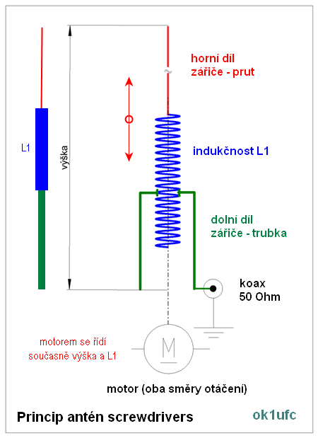 3. z indukčnosti (schéma: modrá), jejíž velikost závisí na délce zašroubování vlastní cívky, která má horní konec obvykle spojen s horním dílem zářiče a konkrétní závit (zaleží na vyšroubování cívky) má propojen s trubkovým zářičem na horním konci;