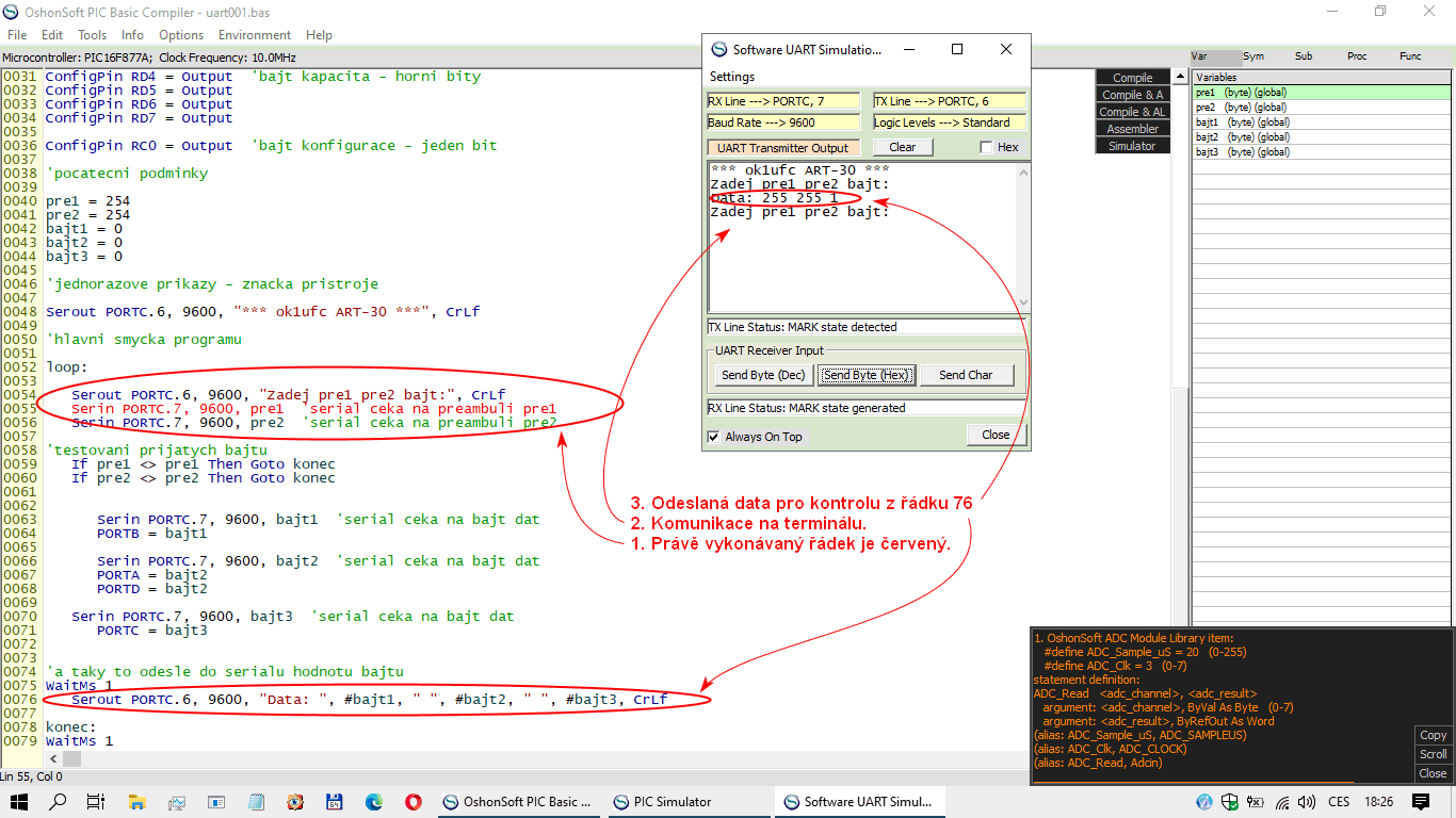 mikrokontrolérem. UART terminál je propojený s editorem, takže zrovna