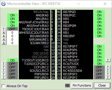 8 pinů portu B (RB0 až RB7), druhý bajt mi rozsvítil čtyři piny (bity)