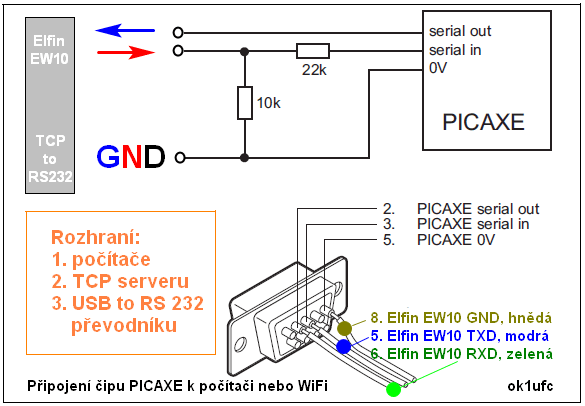 2. Zařízení s čipem PICAXE lze připojit k sériovému portu PC, k sériovému portu převodníku USB-RS232 nebo k  TCP serveru (modulu) Elfin EW10.