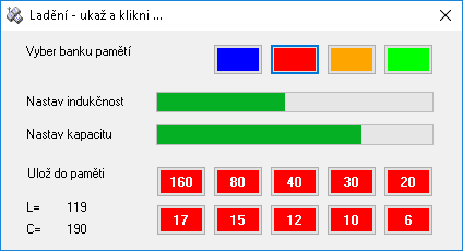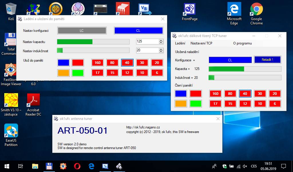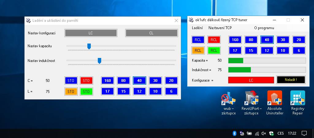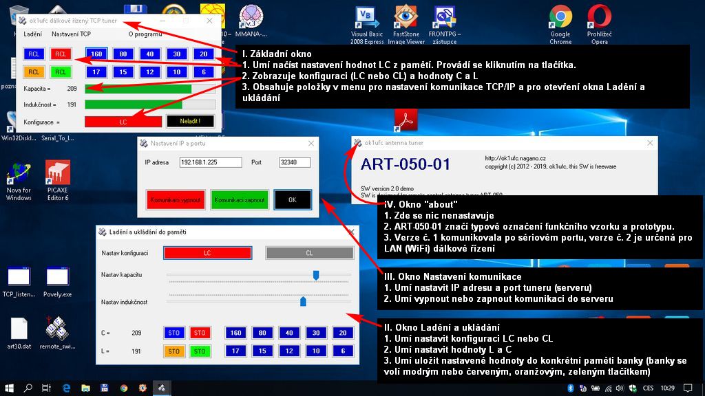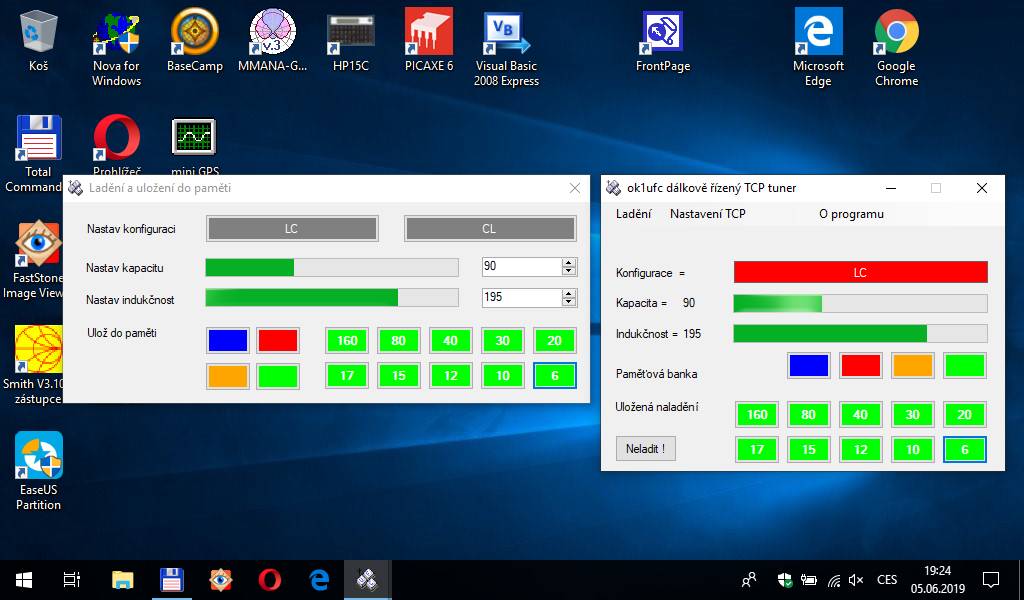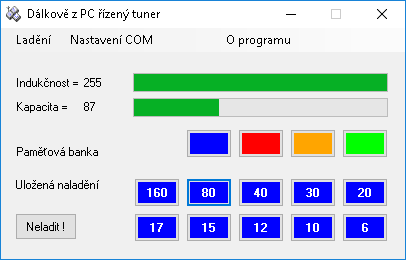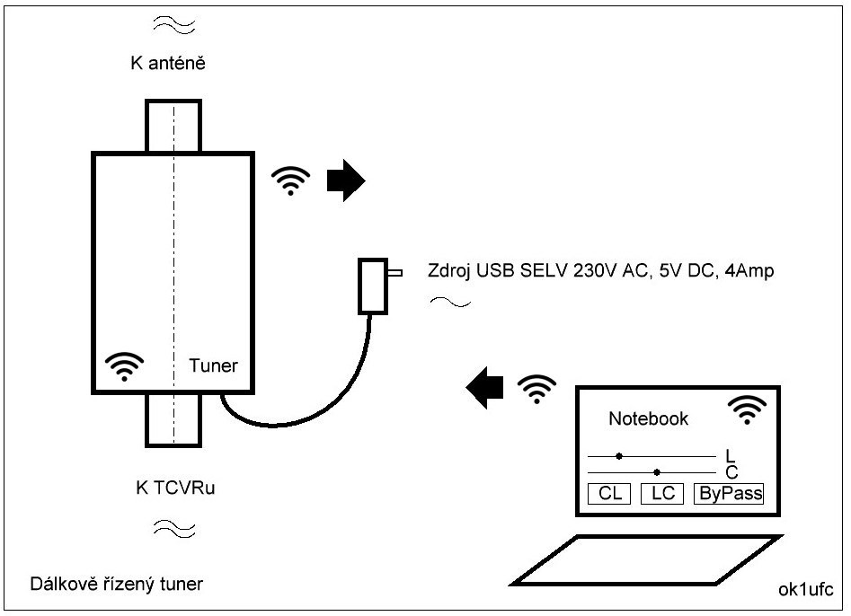 komunikace po LAN, s využitím WiFi. Provedení tuneru lze vyjádřit tímto jednoduchým schémátkem. U antény máme hned na svorkách (nebo za balunem) tuner. Tuner je napájený adaptérem (SELV). Tuner přijímá povely po WiFi síti z našeho notebooku, na kterém nám běží komunikační program. Lze nastavovat způsob přizpůsobení (tlačítky LC nebo CL a myší hodnoty L a hodnoty C pomocí posuvníčků):