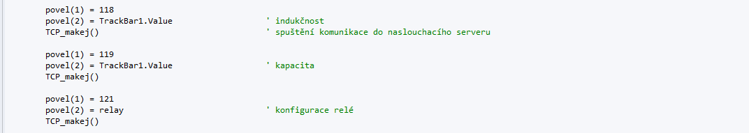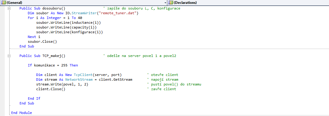 Důležité SW algoritmy V této příloze je zazipovaný celý zdrojový kód programu (Visual Basic). Ten vznikl z původního kódu před rokem 2012, kdy se tuner používal jako dálkově ovládaný pomocí sériové komunikace. V roce 2019 byl modifikován - komunikace RS 232 byla z kódu odstraněna a byla naprogramována TCP/IP komunikace pomocí TCP/IP klienta. Důležtá procedura je níže a pod ní jsou dosazovací příkazy z příkladem, jak se data plní ze sliderů aplikace. Před datovými bajty jsou adresy čipů, které tvoří prambuli. Čip v tuneru reaguje jen na svou preambuli, kterou má naprogramovanou v bajtech qualifier. Podrobnosti - viz popisy sériové komunikace u čipů PICAXE. |