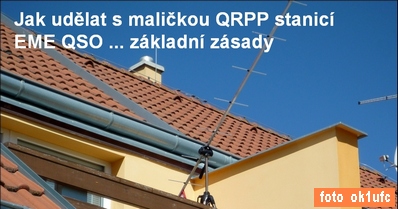 1. Základní zásady QRPP EME QSO 1.1. Jak udělat s maličkou QRPP stanicí EME QSO 1.2. Hotelový minisetup pro EME (kategorie UHF small 70 cm s krátkou tovární yagi anténou a LNA) 1.3. Postřehy a experimenty na ARRL contestu dne 4.11.2017 1.4. Starší články s popisem malé QRP staničky pro EME 2. Obvody klíčování a řízení 2.1. PTT/RX/TX přepínač