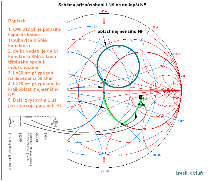 šroubovice k LNA, s pokusem o optimalizaci šumového čísla. Ve Smithově
