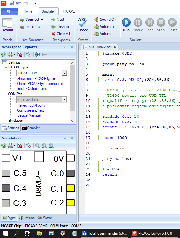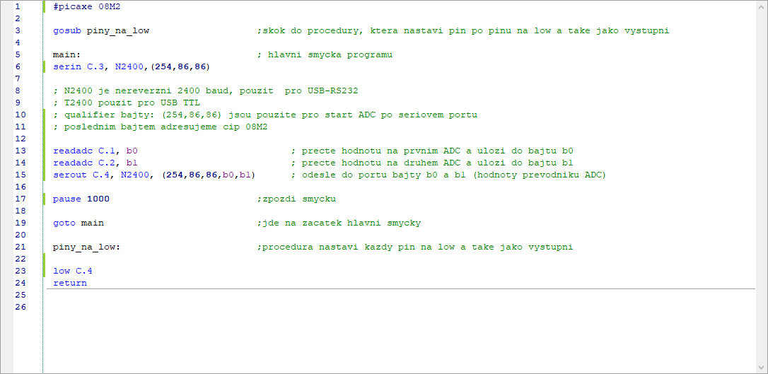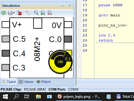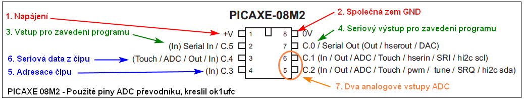 1. Čip PICAXE 08 M2 převádí pomocé instrukce readadc