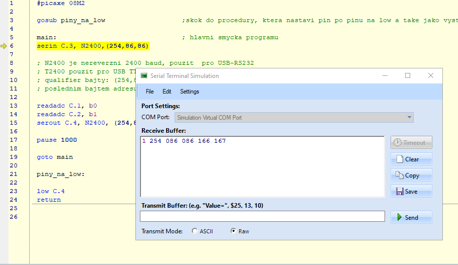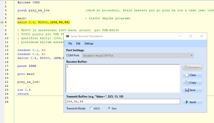 Na simulátoru musíme tuto sekvenci poslat z vestavěného