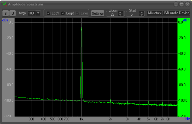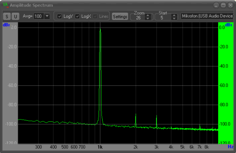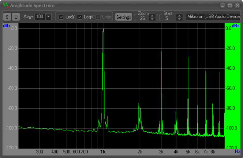přebuzení USB audiokarty ve výstupním spektru a jaká je jejich úroveň.