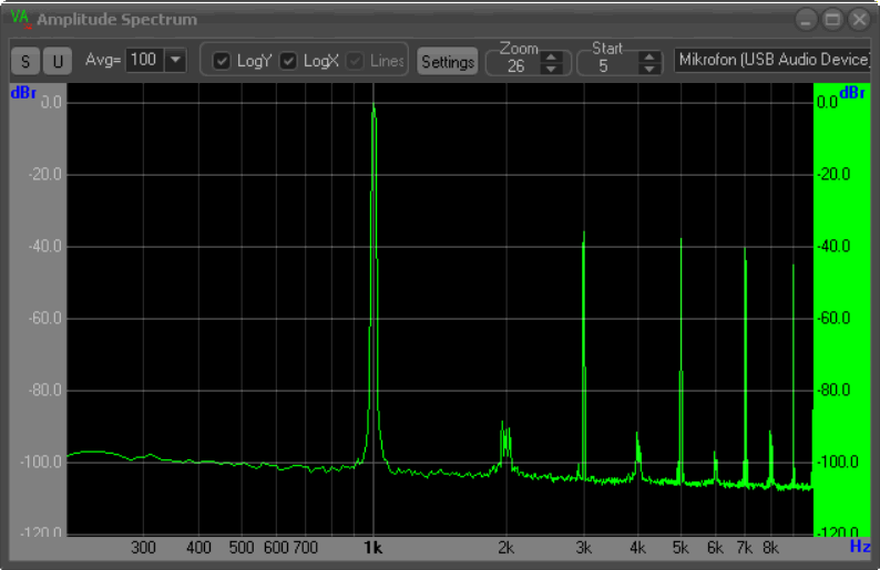 Vidíme, že úroveň základní harmonické (1 kHz) se nezvýšila, ale ve
